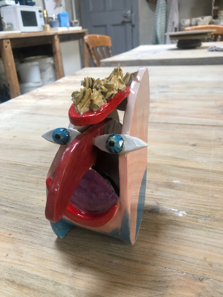 My latest ceramic abstract head…he’ll be keeping an eye out around the house! I used my chefs piping bag for his ‘hair’….hmmm bit of a different approach. Made at Chelston Workshops in Torquay.